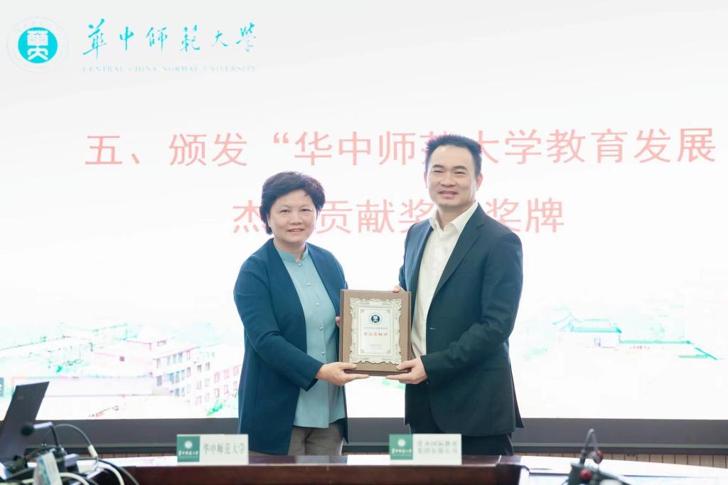 仪式上,爱圣国际教育集团有限公司捐赠1000万元人民币,用于支持学校重点学科建设、人才培养、文化建设等方面工作,学校向关云平校友颁发了教育发展杰出贡献奖奖牌等。关云平表示,“求实创新立德树人”的华师校训及“忠诚博雅 朴实刚毅”的华师精神对自己的创业历程产生了深厚影响。将捐赠善款用于学校师生是非常有价值的事情,而这不是自己最后一次为学校捐赠,希望接下来的合作沟通可以更加紧密,为回馈母校作出更大贡献。