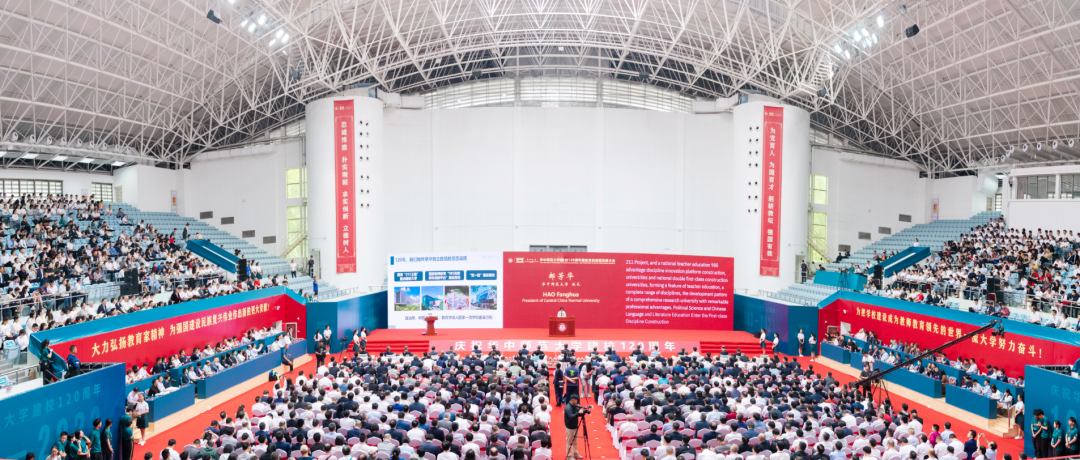佑铭体育馆内,中外宾朋欢聚一堂,洋溢喜庆热烈氛围。主席台两侧,悬挂着“为把学校建设成为教师教育领先的世界一流大学努力奋斗”“大力弘扬教育家精神,为强国建设民族复兴伟业做出新的更大贡献”横幅,彰显着百廿华师特色鲜明的办学目标和矢志不渝的使命担当。