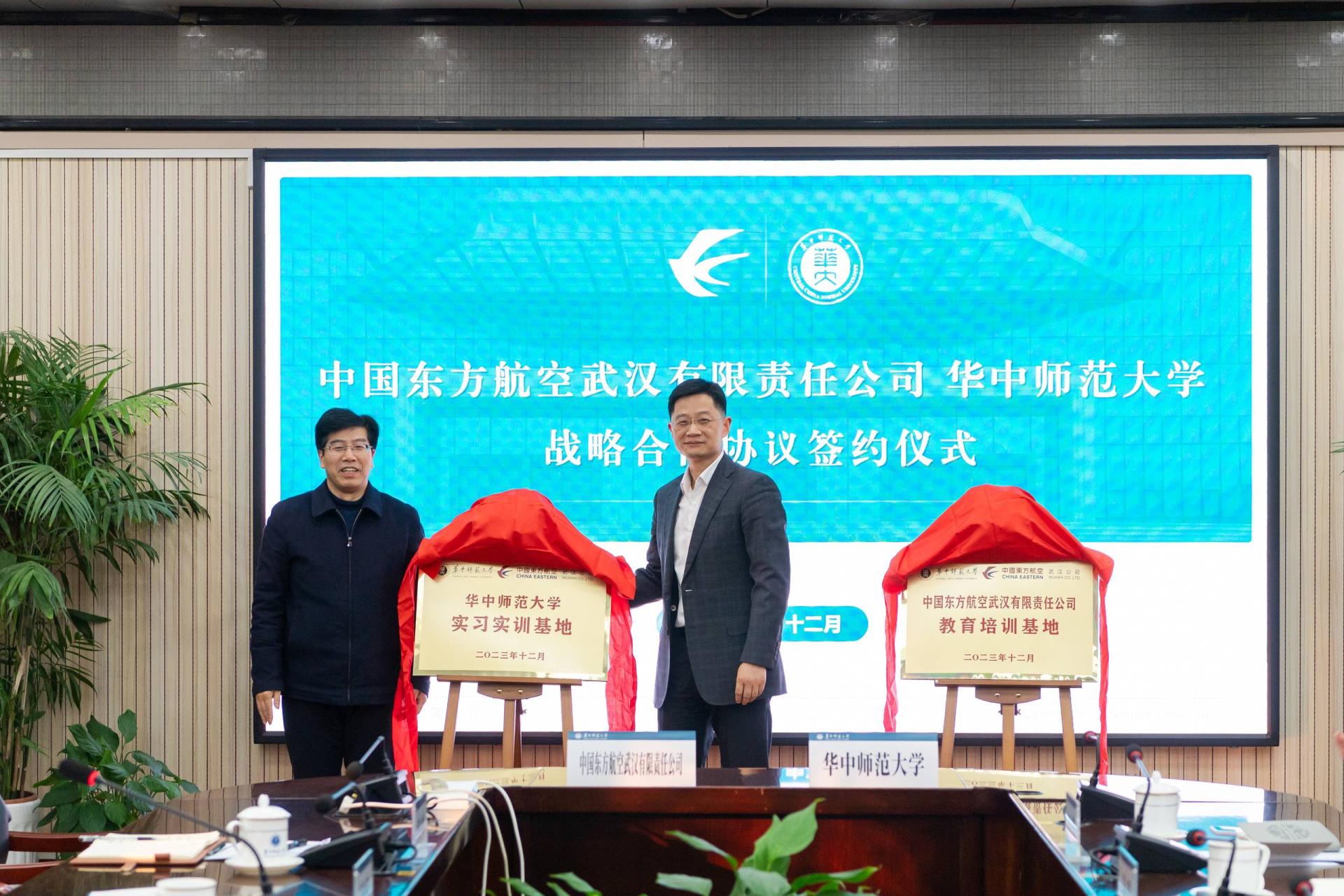 李良斌与彭双阶代表双方单位为中国东方航空武汉有限责任公司教育培训基地、伟德手机入口实习实训基地揭牌。