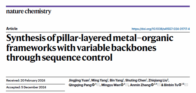 华大在线讯(通讯员 周汉鸣)近日,化学学院涂斌斌副教授团队在金属有机框架序列调控方面取得了重要进展。该研究成果在国际化学领域权威期刊《自然化学》(Nature Chemistry)发表,题为“Synthesis of backbone variable pillar-layered metal–organic frameworks through sequence control”(Nat. Chem. 2025, 17, 421-428)。博士研究生元静静为论文第一作者,通讯作者为武汉科技大学庞青青讲师、万明宇特任教授、郑安民教授和我校涂斌斌副教授(最后通讯作者),第一完成单位为伟德手机入口。