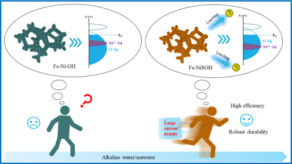 合理设计快速自重构并能在商业所需大电流密度下稳定运行的高效OER电催化剂是提高电解水制氢效率的关键,但充满挑战。为此,该团队研究人员开发了简单的两步氧化策略,在泡沫镍上原位生长铁修饰的羟基硫化镍(Fe-NiSOH)纳米片阵列,实现了高效稳定的大电流密度水/海水氧化。通过系统的研究表明,Fe-NiSOH中的S原位析出加速了电极的自重构过程,并促进生成了高活性的Ni4+,从而促发晶格氧机理。此外,得益于Fe-NiSOH电极优异的物理化学性质,在碱性水中分别只需要207、240和268 mV的过电位就可以提供10、100和500 mA cm-2的电流密度,而且能够在商用电流密度(500 mA cm-2)下稳定工作1100小时。更重要的是,它还具有良好的海水氧化活性和优异的抗海水腐蚀能力,在500 mA cm-2稳定运行超过了900小时,具有很好的应用前景。这项研究为构建快速自重构、高效稳定的电解水/海水催化剂提供了一种新的思路,也为电解海水的工业化应用提供了性能优异的催化剂。